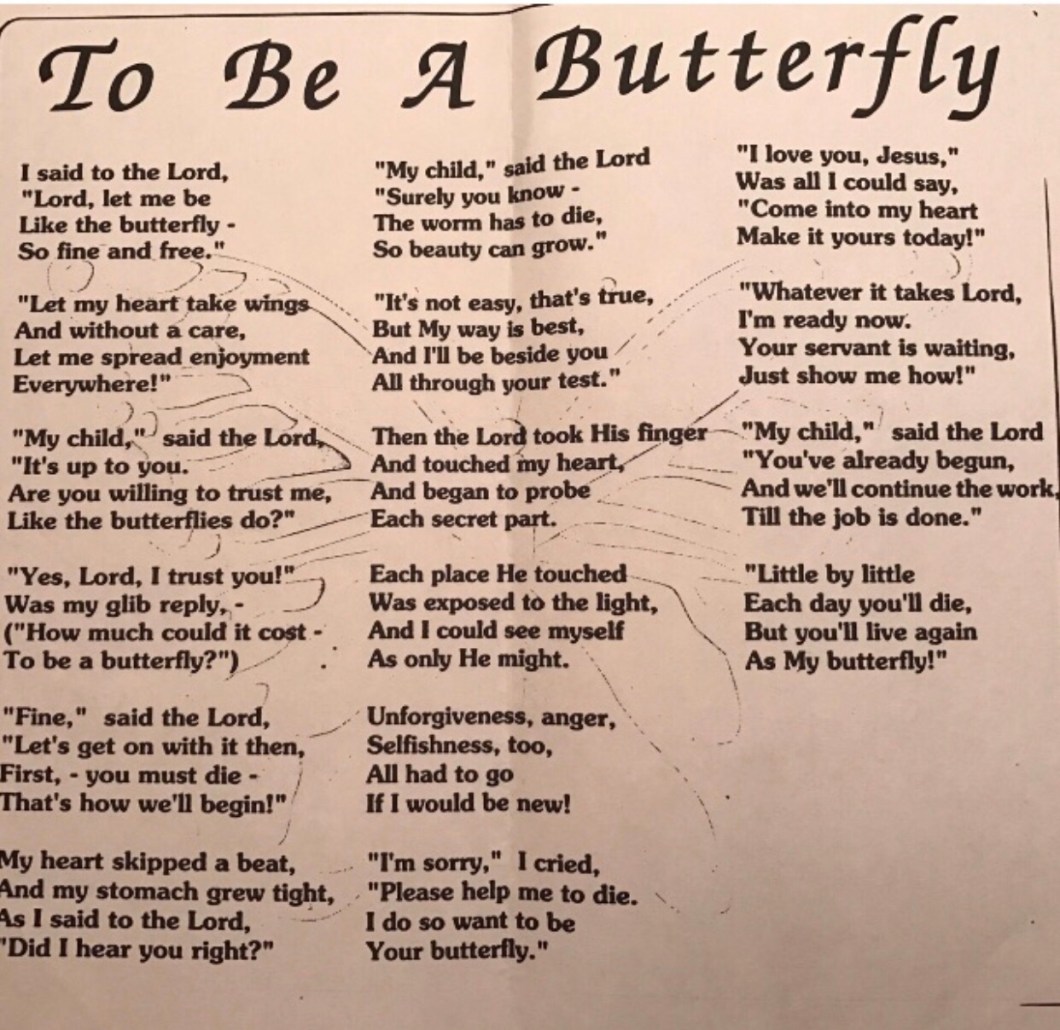 It wasn’t until later that I learned about metamorphosis of the butterfly and began to understand the symbolism of what it means to “die to self”. I was in Junior High then…learning about the butterfly “life cycle” in Science class. I had no idea that a caterpillar would become a butterfly. Caterpillars were “weird” looking and moved their bodies in a way that seemed slow and laboring, inching forward just a little a time. So much work for so little progress. That was me all right…..not very pretty to look at and painfully shy. I didn’t seem to make much progress forward in life…everything seemed twice as hard and seemed to never be enough. Little did I know that very same year, God would place His hand on my life and plant His love in my heart and I would begin to fully understand His sacrifice for me on the cross and what that would mean for my life.