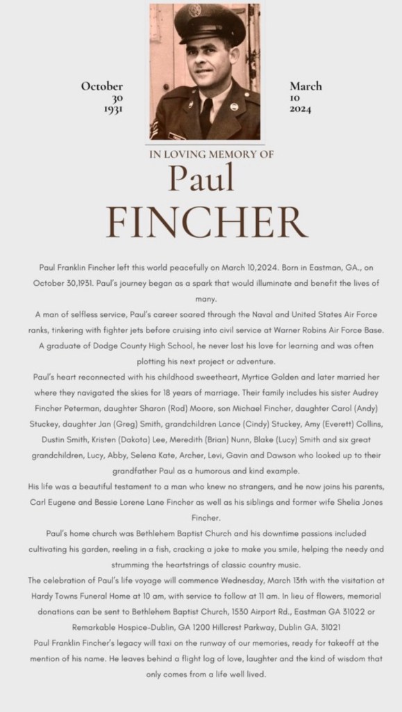 1. What a legacy your Daddy has left you…..the desire to make people laugh and make their troubles disappear at least for a little while. And the desire to serve. I can’t think of two better qualities in a person and you are definitely your Father’s daughter. The obituary is a wonderful tribute, Sis.